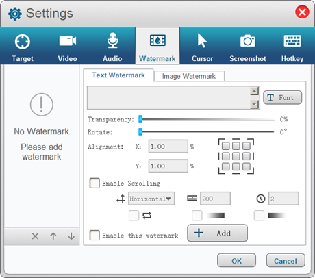 Gehen Sie im Fenster "Einstellungen" einfach zu "Wasserzeichen", um dem aufgenommenen Video ein Text- und Bildwasserzeichen hinzuzufügen.