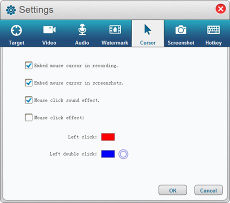 「設定」ウィンドウで、「カーソル」に移動するだけで、「録画にマウスカーソルを埋め込む」を選択または選択解除できます。